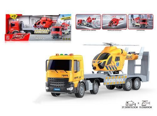 Este camión de plataforma lleva un increíble helicóptero de rescate, ¡todo en uno!.