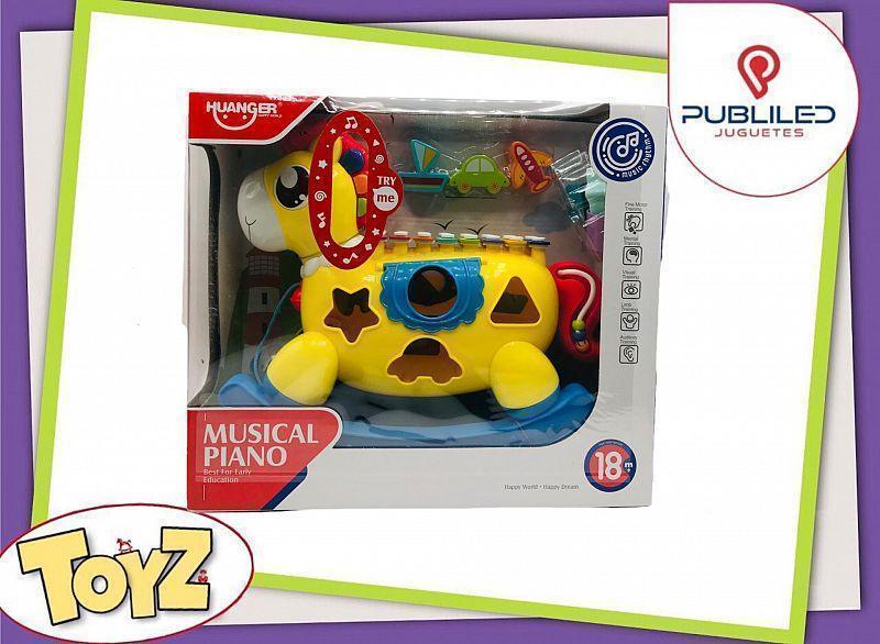 En la cabeza tiene un botón con luz y sonido. Los palitos para tocar se encuentran en la hamaca del pony. Medidas de la caja: 33 cm. x 29 cm.