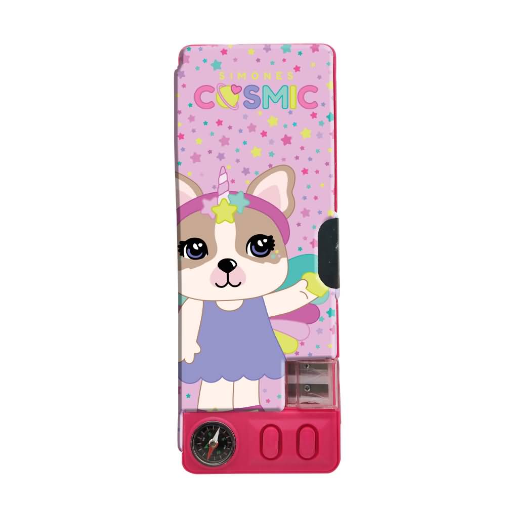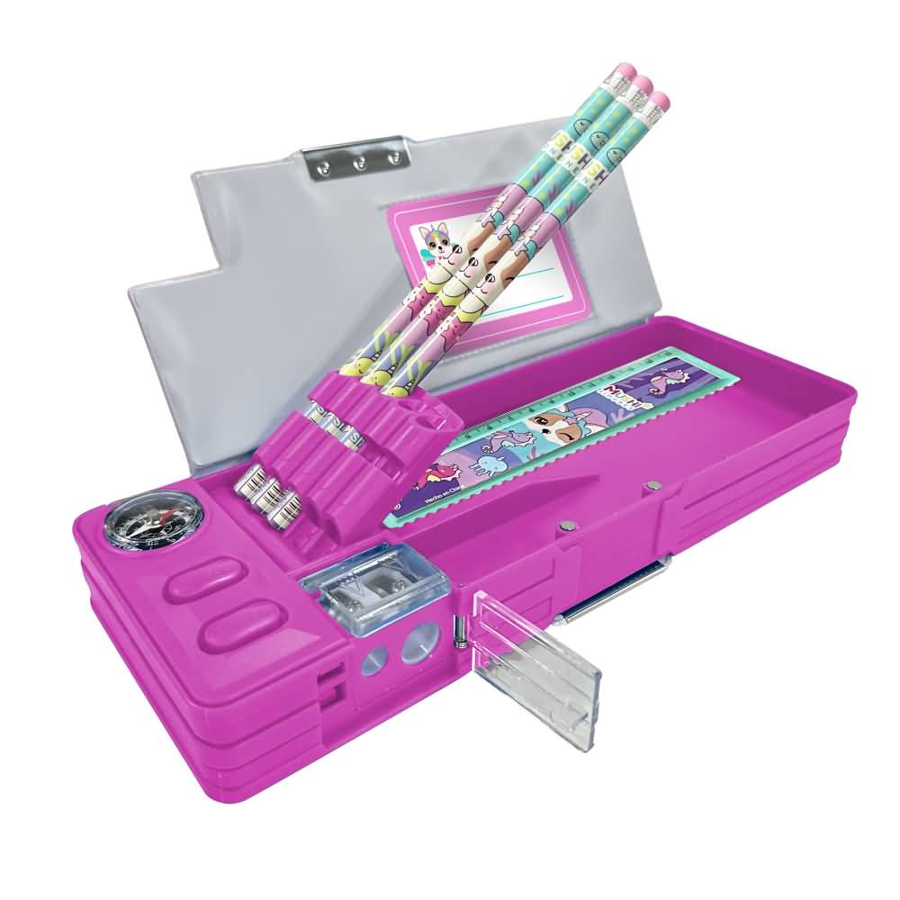 NO INCLUYE UTILES. Características:- Brújula.- Sacapuntas incorporado.- 2 compartimentos con cierre magnético. Funciones adicionales:- Botón para abrir la puerta del sacapuntas.- Botón para levantar el espacio de almacenamiento de hasta 5 lápices. Material: Plástico. Dimensiones: Largo x Ancho x Profundidad: 24.5 cm. x 9 cm. x 3.5 cm.