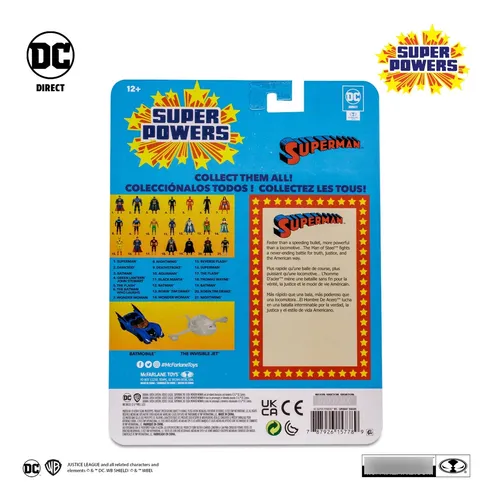 Viene empaquetado en el icónico embalaje de tarjeta blíster de Super Powers con obras de arte actualizadas y logotipos que reflejan tus personajes favoritos