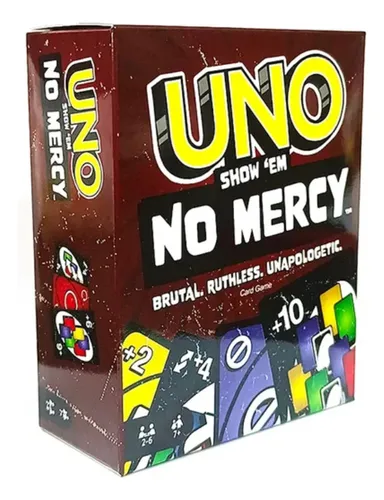 ¡El UNO Show em No Mercy es la versión más despiadada hasta la fecha! Incluye muchas más cartas, las penalizaciones son mucho más duras (¡puede que tengas que robar 10 cartas!) y hay reglas nuevas que obligarán a los jugadores a recopilar penalizaciones y a intercambiar y robar más cartas que nunca. Además, incluye la regla Sin remordimiento (literalmente) para cuando las cosas se compliquen demasiado. Hay dos maneras de ganar en esta despiadada versión del juego clásico: deshacerse de todas las cartas O echar a todos los demás jugadores de la partida. Ah, y si consigues quedarte solo con una carta, no olvides gritar “¡UNO!”
