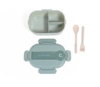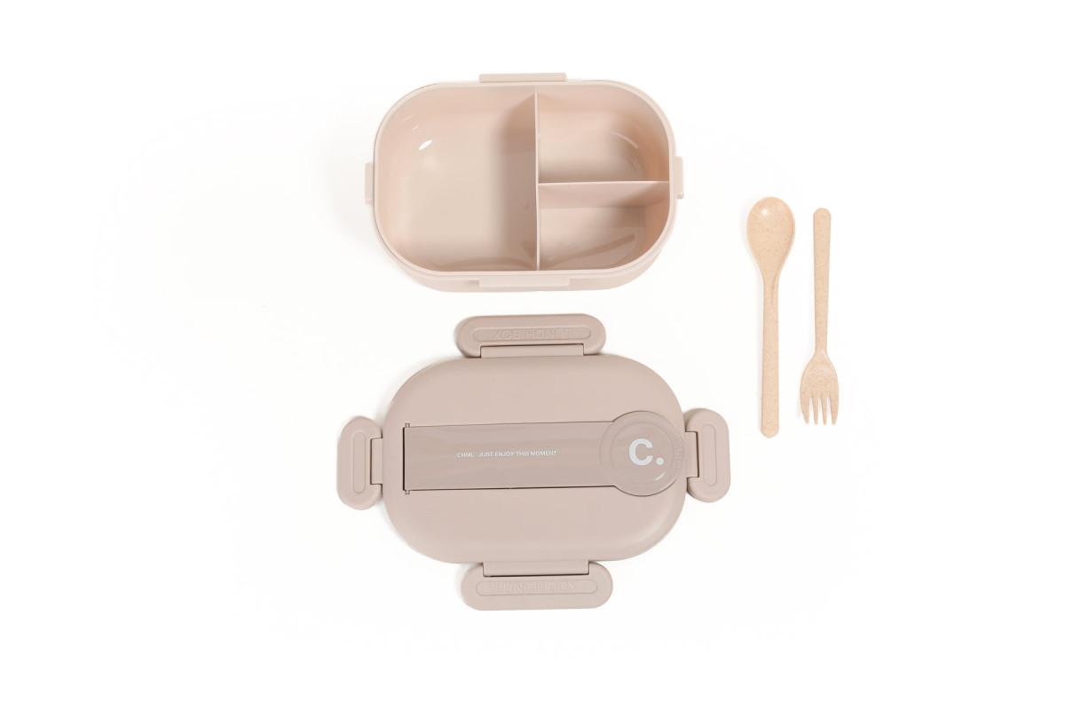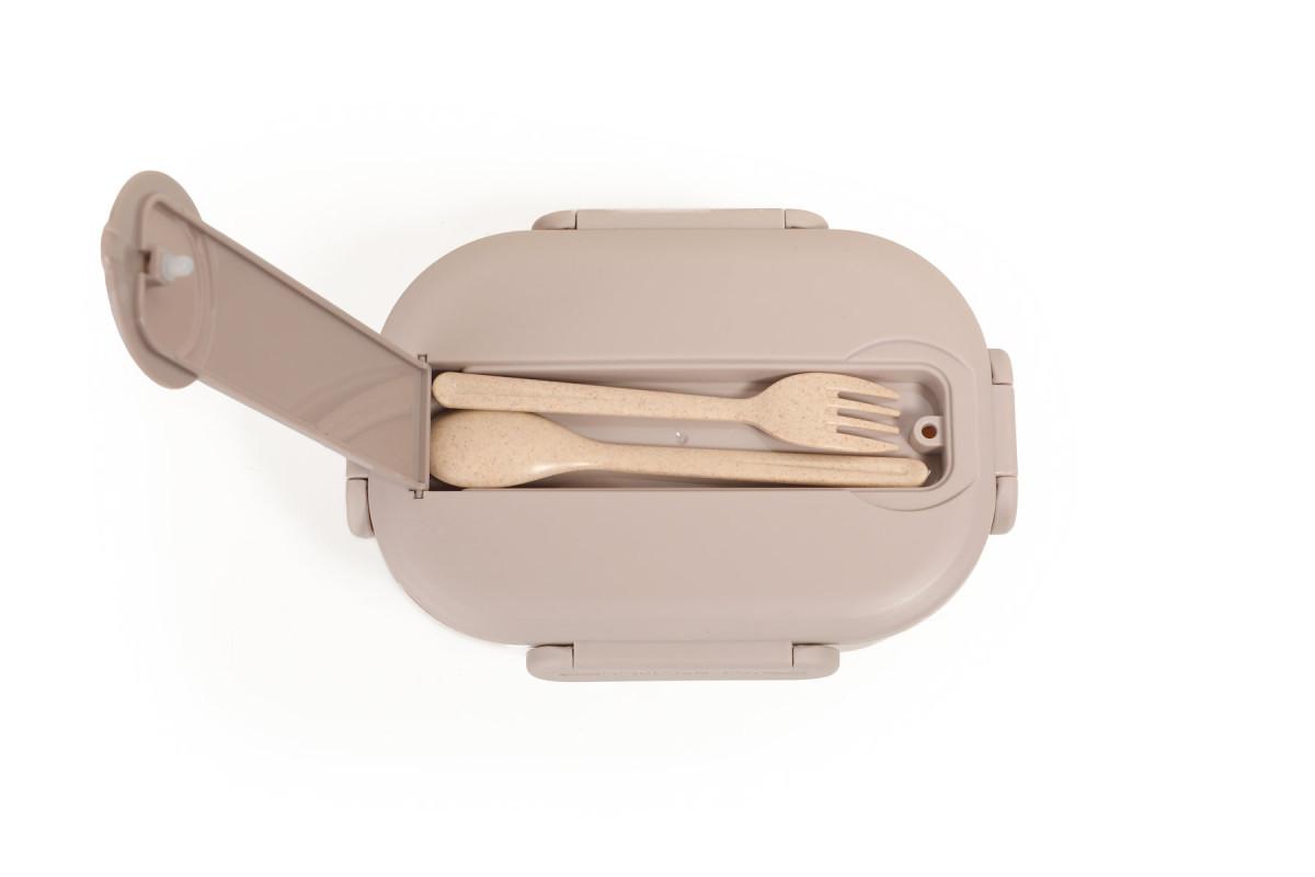Lunchbox con compartimentos internos y cubiertos integrados.