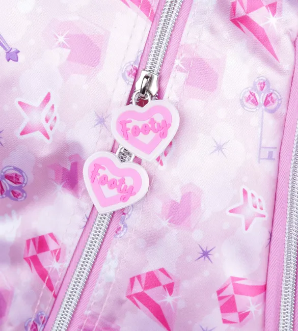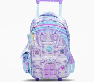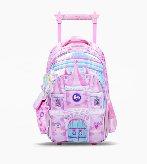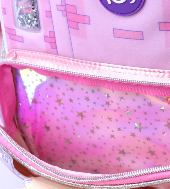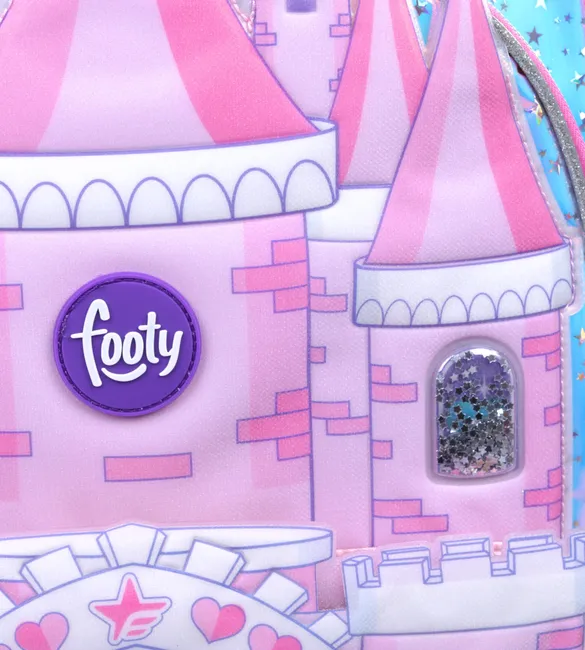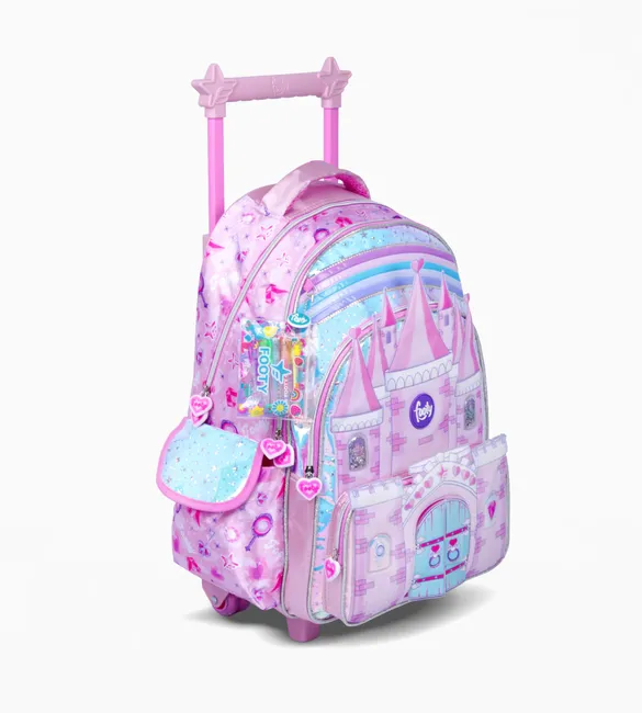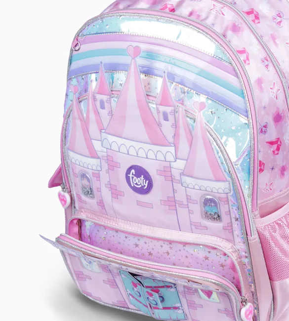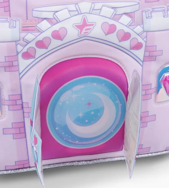 3 compartimientos principales + 1 Bolsillo frontal con aplique de castillo con puertas que se abren y 2 bolsillos laterales