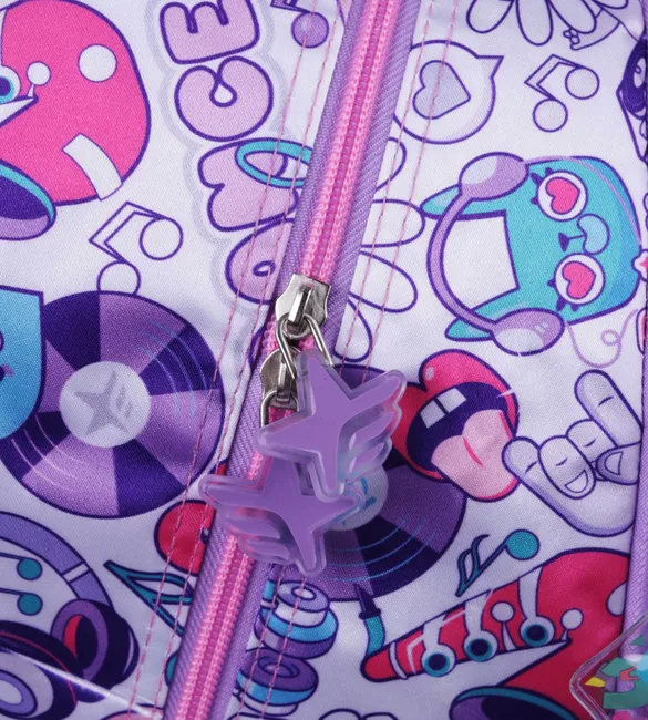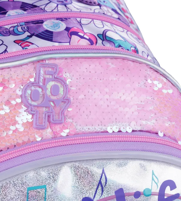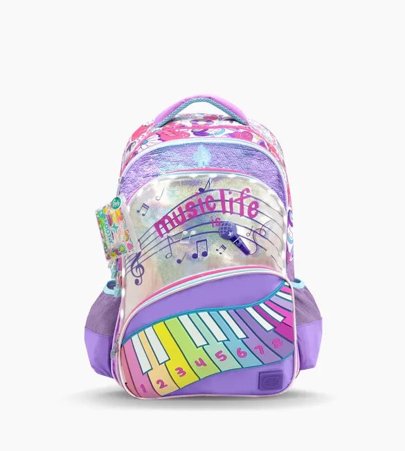 3 compartimientos principales grandes + 1 bolsillo frontal con piano de rubber y sonido de notas musicales en teclas.