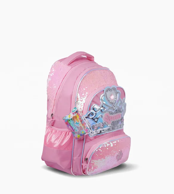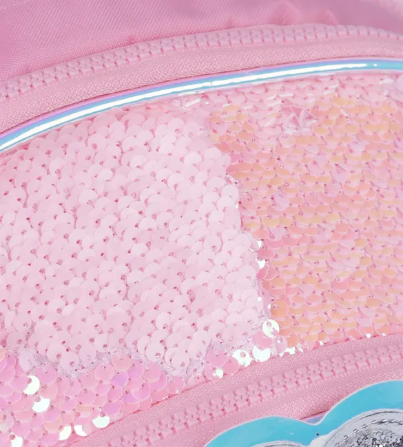 3 compartimientos principales grandes + 1 bolsillo frontal con lentejuelas reversibles y 2 bolsillos laterales para botella de agua de red reforzados abajo.