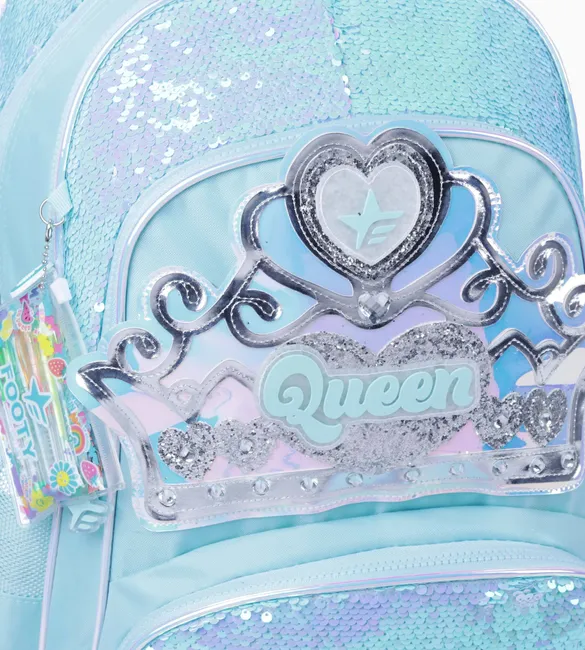 3 compartimientos principales grandes + 1 bolsillo frontal con lentejuelas reversibles y 2 bolsillos laterales para botella de agua de red reforzados abajo.