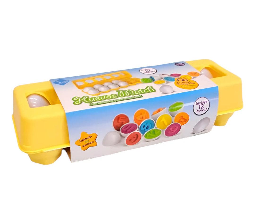 Set didáctico de encastre que incluye una huevera con 12 huevos multicolores, ideal para estimular los sentidos y la coordinación mano-ojo en los más pequeños.