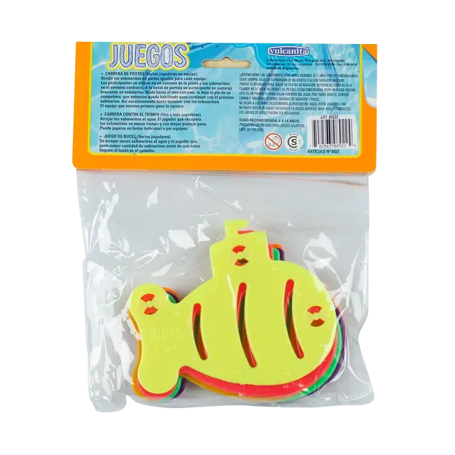 El set incluye 6 submarinos de colores variados, diseñados para hundirse en el agua y ser recuperados buceando.