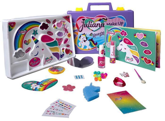 Maquillaje para la cara, un chocker para armar con dije de unicornio, labiales,