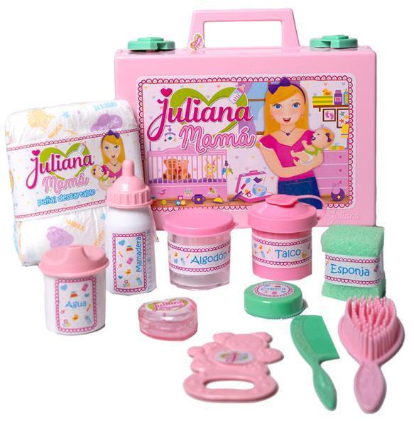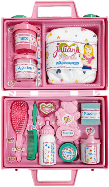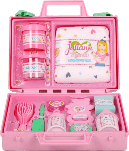 Pañal, mamadera, peine, cepillo, mordillo, biberón de agua, esponja y recipientes