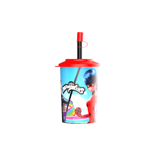 Vaso chico con tapa de plástico estampado.
