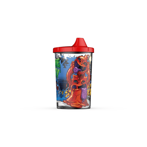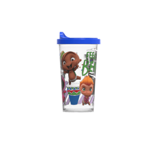 Vaso chico 240 ml. con tapa de plástico estampado.